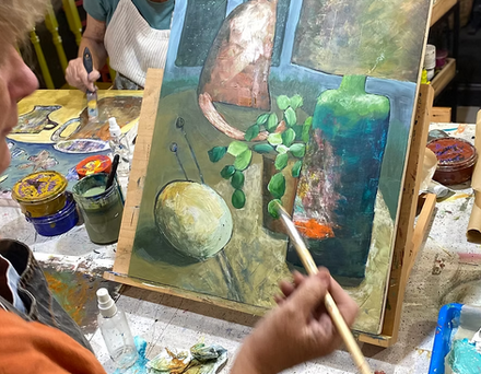 Day 2 – Noticing Today is all about tuning in and beginning gently. We’ll wander around our surroundings, noticing objects, light, shadow, shape, and, most importantly, colour. Take time to observe what you're drawn to: the buildings, the plants, the sky, the atmosphere. You’ll choose a few small objects that catch your eye. These will be our springboards, exploring how they relate to one another and how we can use them to develop compositions. This isn’t about drawing them perfectly; it’s about breaking them down into line, shape, form and your own expressive marks to begin abstracting what you see. After a glorious lunch, we’ll gather for the afternoon workshop to explore the principles that make a painting work. We’ll explore working with inks on beautiful acrylic paper—expect to get messy! Don’t wear your best holiday clothes! In the evening, we’ll share a relaxed dinner with wine at the Masseria.