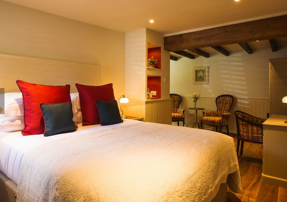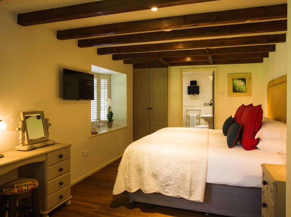 Located just a few meters from the main building, the Classic Coach House Room offers a peaceful and characterful retreat. With rustic exposed ceiling beams and warm wood accents throughout, this room blends traditional charm with modern comfort. This room offers flexibility of twin beds or a luxurious super king-size bed. The private en-suite features a bath with a shower over, perfect for unwinding after a day of exploring.